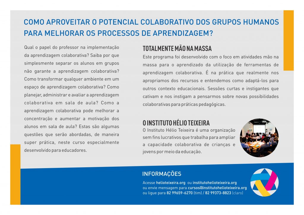 “COLABORAÇÃO NA ESCOLA” é o mais novo curso do Instituto Hélio Teixeira. Maiores informações pelo telefone (82) 99659-6270 ou pelo email cursos@institutohelioteixeira.org